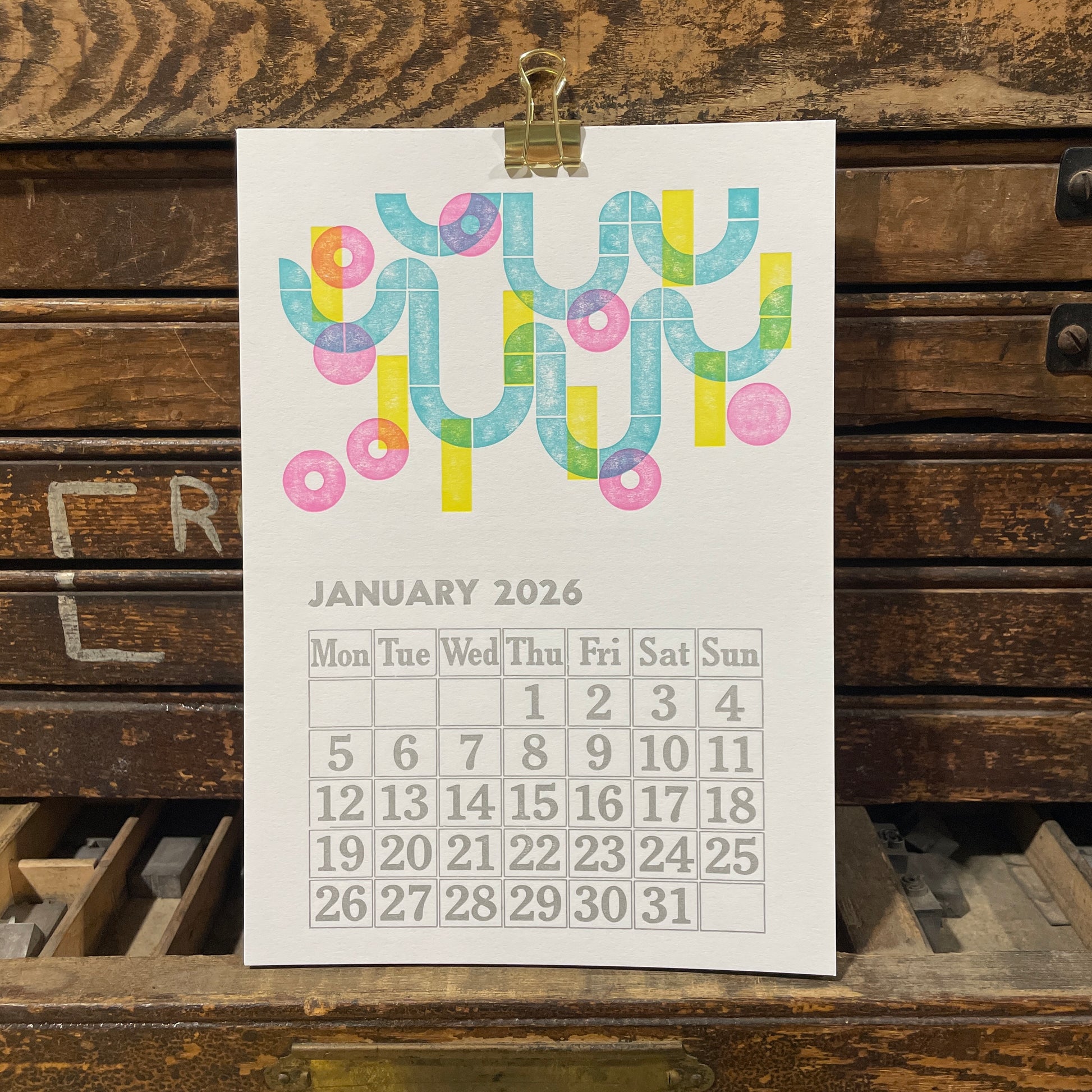 This 2026 calendar is hand-made, hand-printed, and full of bright colours and pattern play using Lego tiles.