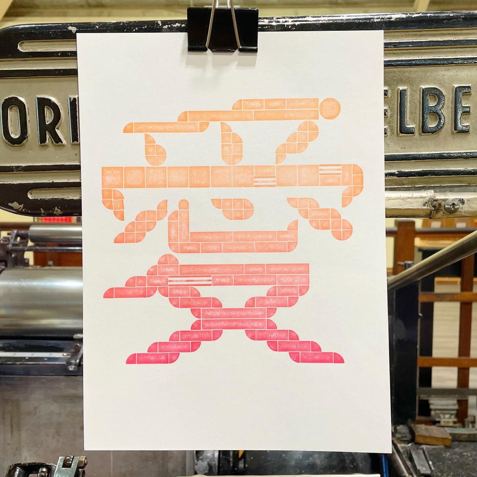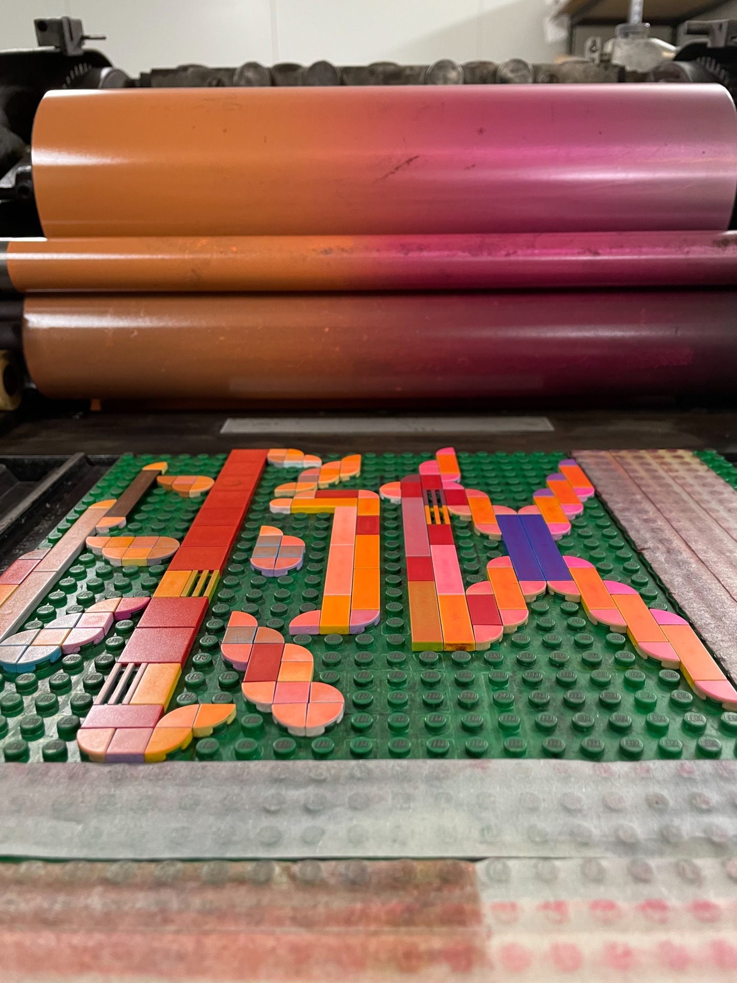 - Using Lego tiles and letterpress printed in a gradient of orange to pink on 250gsm white stock.