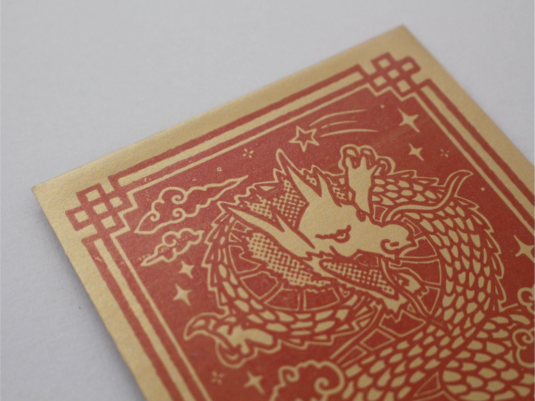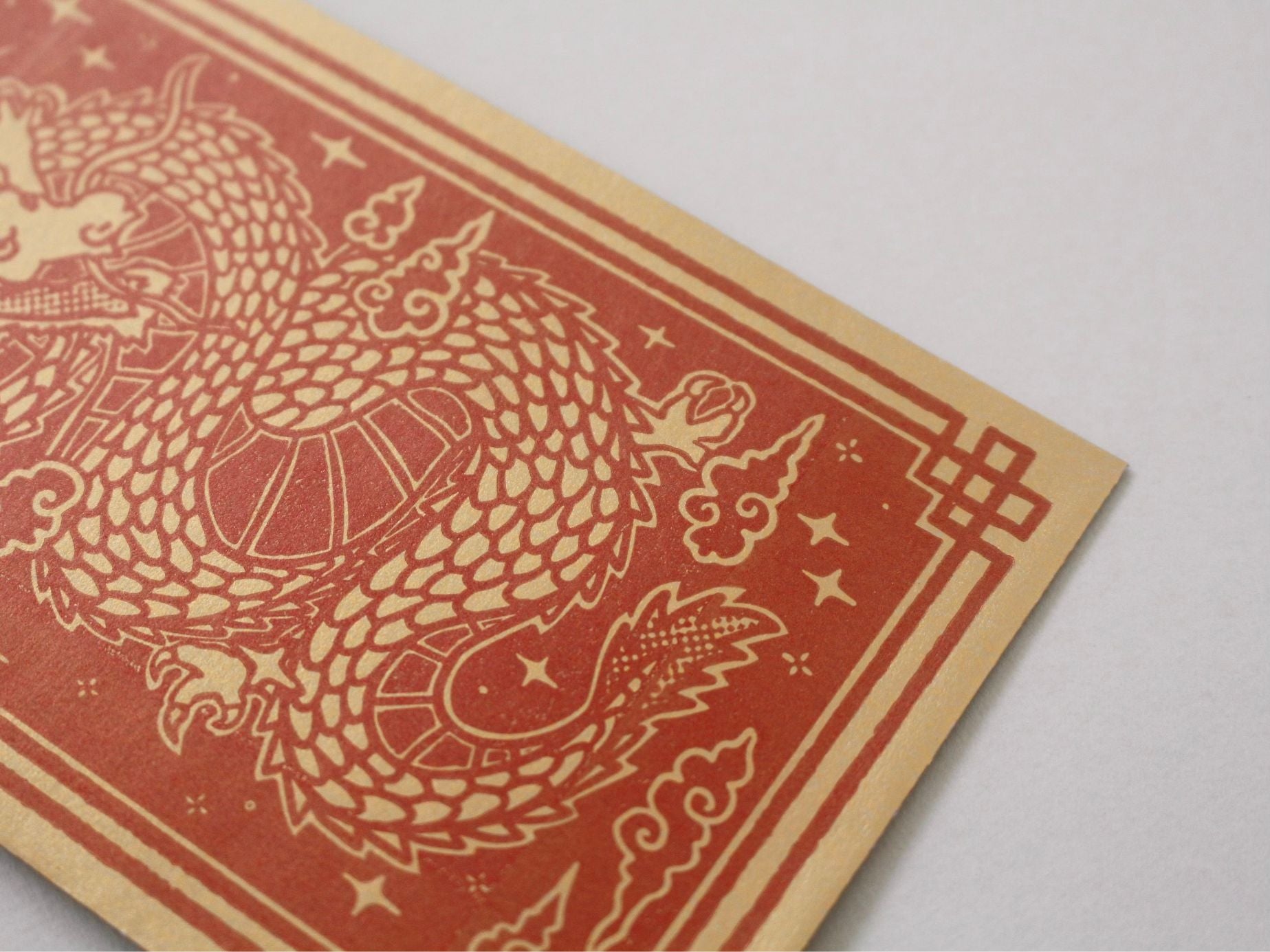 To celebrate the Year of the Dragon, Bright Press collaborated with fellow Asian Australian artist Ophelia Roberts of Banksia Creative and we have created letterpress printed red envelopes (also known as hongbao or laisee) featuring a hand-drawn illustration of a dragon surrounded by celestial clouds and stars and a decorative border.
